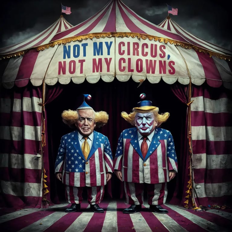 Circus tent made out of a worn US flag with text that says 'Not my circus not my clowns.' With Biden and Trump dressed as clowns in a suit made of the US flag.
