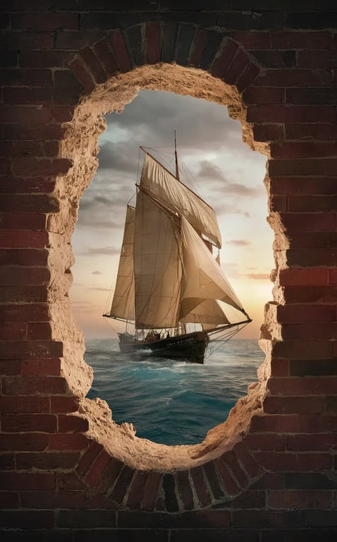 pareidolic anamorphosis of a hole in a brick wall morphed into a hublot of a sail boat, a window to the sea.